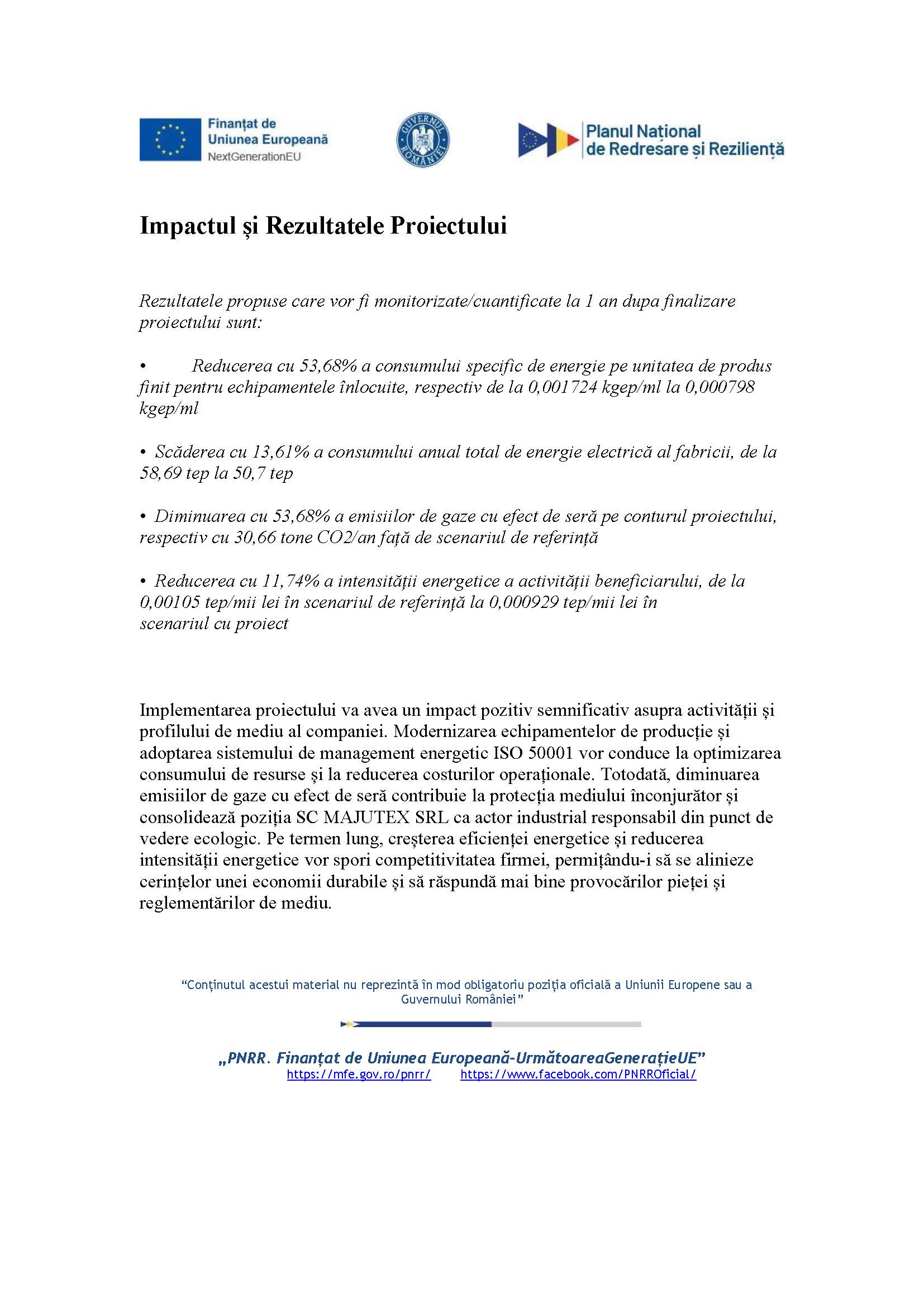 Proiectul de investiții propus de SC MAJUTEX SRL pentru creșterea eficienței energetice în procesele de producție textile va avea un impact pozitiv semnificativ asupra prevenirii și controlului poluării aerului, apei și solului, prin implementarea planului de măsuri recomandat în urma auditului energetic. În primul rând, principala contribuție a proiectului la reducerea poluării este dată de economiile substanțiale de energie care se vor obține prin înlocuirea utilajelor vechi și ineficiente din secțiile de urzire, țesere și imprimare cu unele noi, de înaltă clasă energetică.